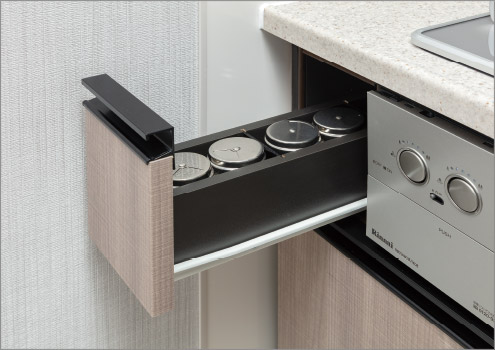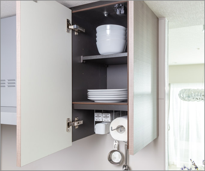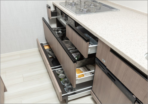 出し入れしやすく、奥のものまで取り出しやすいスライド式。静かにスムーズに閉まるソフトクローズ仕様です。(一部除く)