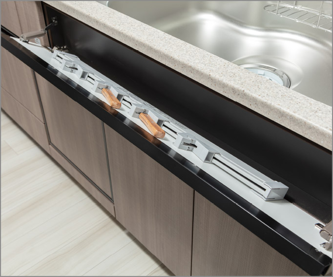 シンク前に包丁差しを設置。お子様が不用意に触れることを防ぐチャイルドロック付き。取り外して水洗いができます。