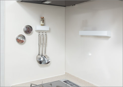 油汚れが染み込まないホーロー素材のキッチンパネルはお掃除が簡単。マグネット製品類も取り付けることができます。