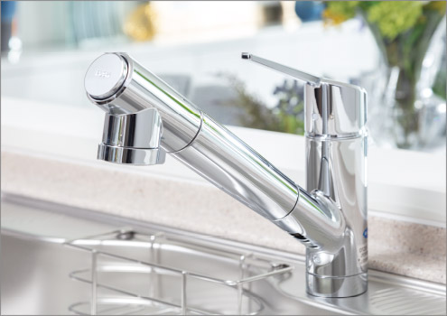 料理をしながら片手で簡単に操作ができる機能的な水栓。ホースを引き出すことにより使い勝手も向上します。
