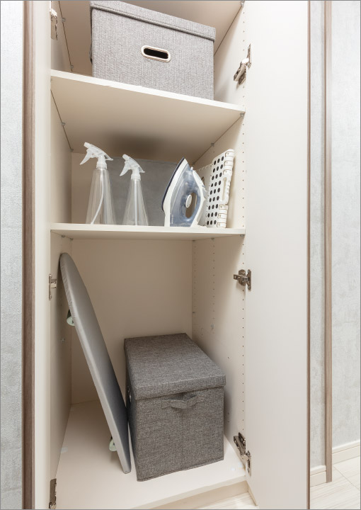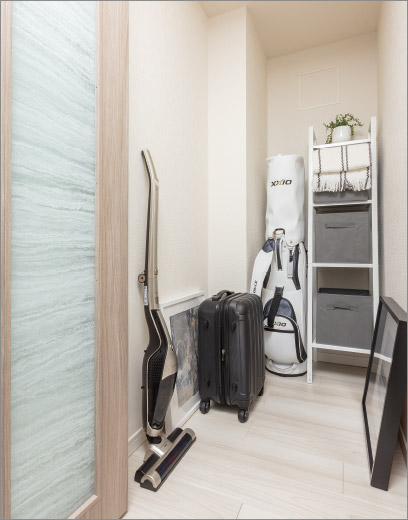 掃除機やスーツケースなど、かさばる物もしっかり収納。お子様のおもちゃをしまう空間にもぴったりです。