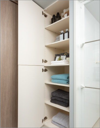 リネン類のほか、洗剤や入浴剤などの保管庫としても活躍。散らかりがちな洗面室の整理整頓に活躍します。