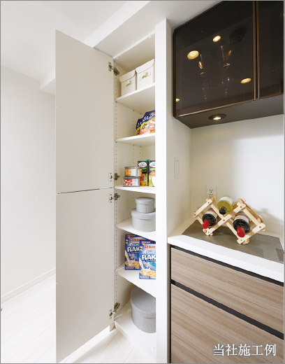 キッチンに設定した食品庫。パスタやお米、スパイス類など、すっきりしまえてサッと取り出せるスペースです。