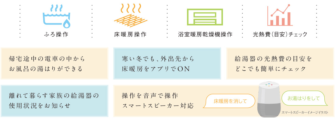 どこでもリンナイアプリを使えば、スマートフォンから給湯器・床暖房・浴室暖房乾燥機の操作や、