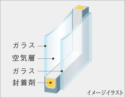 2枚ガラスの間に空気層を設けた複層ガラス。断熱性に優れ、室温の変動を低減するため結露の発生も防ぎます。