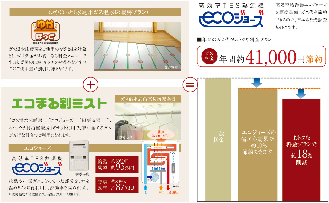 料金プランの適用には、お客様からのお申込みが必要となります。※試算条件:75㎡、4人家族、年間ガス使用量841㎥の場合(京葉ガスシミュレーションに基づく)。※適用料金:2019年10月時点の基準単位料金(原料調整費は含まない)。※一般ガス料金との比較(熱効率向上分も含む)であり、ガス使用状況により異なります。※「ゆかほっとエコまる割ミスト」の適用には、ガス温水式床暖房、ガスコンロ、エコジョーズ、ガス浴室暖房乾燥機、ミストサウナが設置されていることが条件となります。※「エコジョーズ」「ミスティ」は東京ガス㈱の登録商標です。