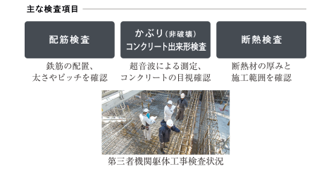 「エクセレントシティ」は、構造躯体の品質管理をより信頼性あるものとするため、第三者機関による検査を実施。躯体工事の重要なポイントである配筋や型枠の状況、コンクリート打設時の状況確認や出来形検査などを入念に行います。客観的な目による構造躯体の品質検査を徹底しています。