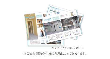 新日本建設では、ご検討中やご成約後のお客様に、現時点での施工状況などの情報をまとめた「コンストラクションレポート(進捗状況報告書)」を作成。図面や現場の状況など、見ただけではわかりづらい専門的な内容や、建物完成後では確認することのできない情報を、写真とコメントでわかりやすく解説し、お客様に少しでもご安心いただけるよう努めています。