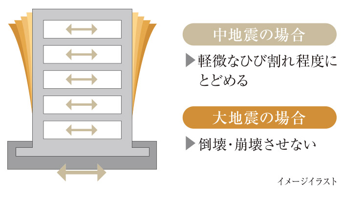 建物自体の強度で地震の揺れに抵抗する耐震構造を採用。極めて稀に発生する大地震の際にも建物が倒壊・崩壊しない耐震強度を確保しています。