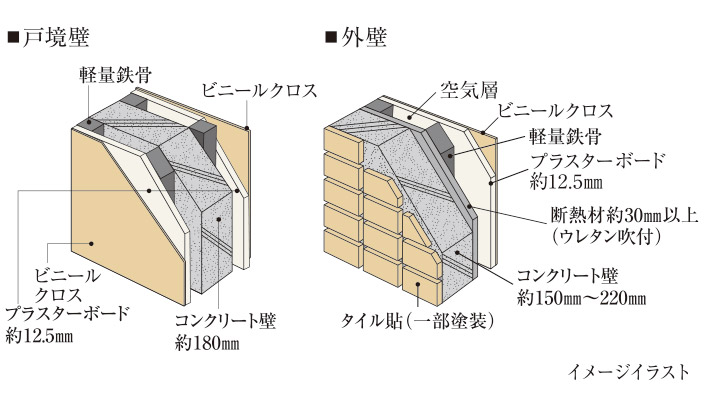 住戸間の戸境壁は約180㎜、外壁は約150㎜〜220㎜以上と充分なコンクリート厚を確保。外部からの騒音侵入はもちろん、隣戸間における生活音漏れに配慮し、遮音性に優れた居住空間としております。(一部住戸除く)