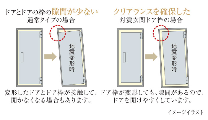 地震時に建物が変形した場合でも、避難のため開閉できる対震玄関ドア枠を採用しています。