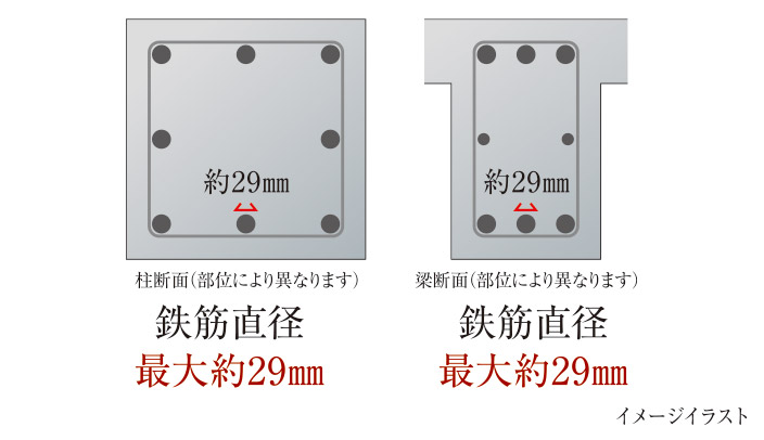 構造計算により鉄筋量を決めています。柱、梁は鉄筋直径最大約29㎜として、末永く安全にお住まいいただける強度を確保しています。