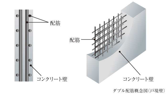 外壁・戸境壁には、鉄筋の組み上げ精度を高め、耐久性及び乾燥収縮のひび割れを極力抑止するダブル配筋を採用しました。