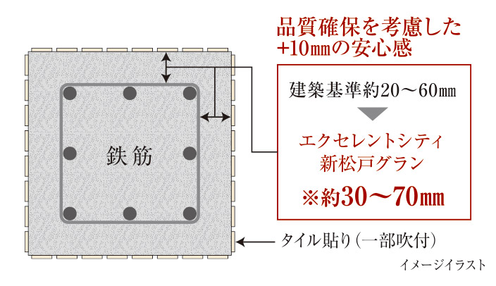 鉄筋を包むコンクリートの厚さ(かぶり厚)を充分に確保し、内部鉄筋のさびを抑制。末永く優れた耐久性を維持します。